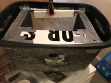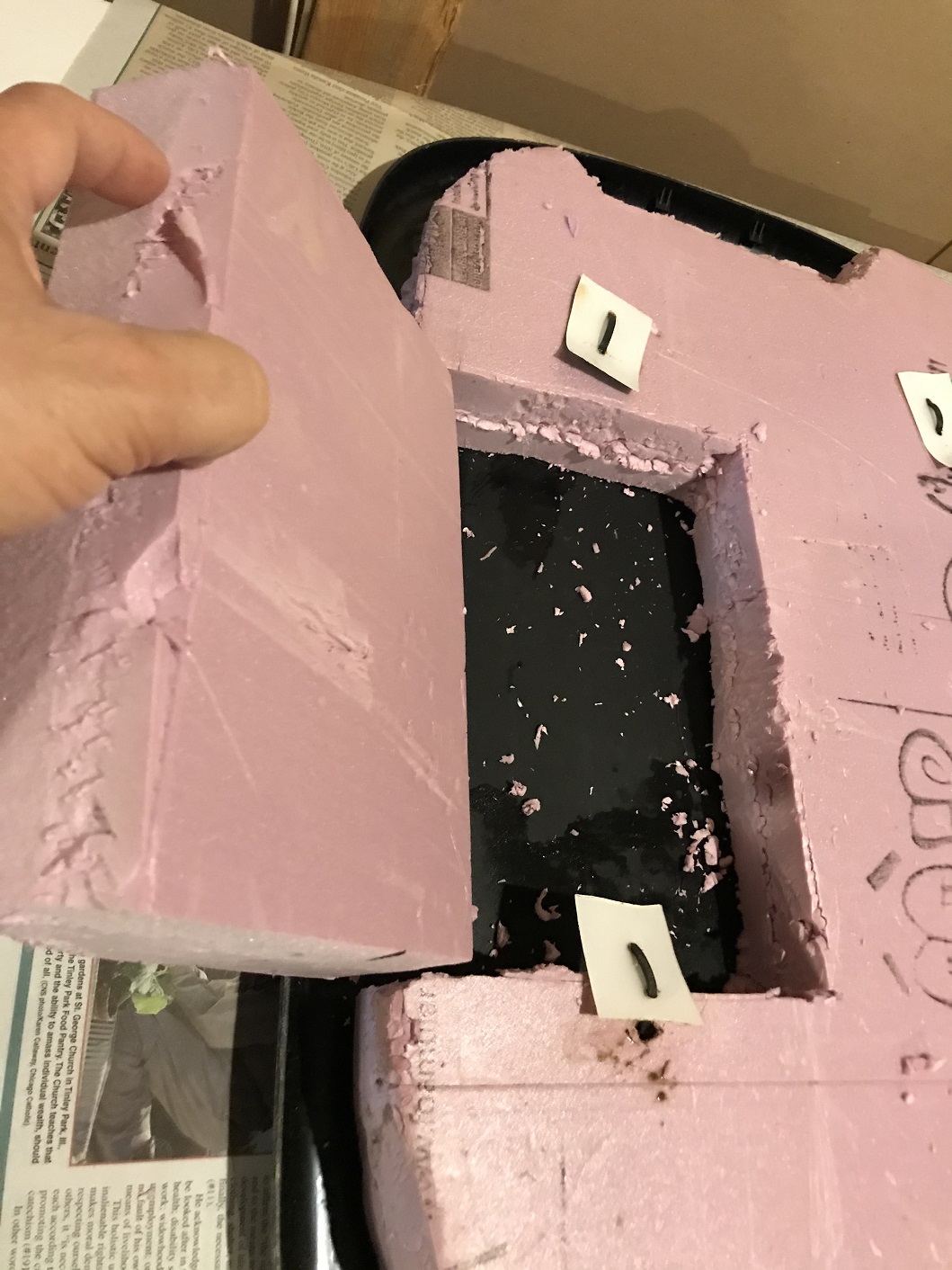 Then I cut a new piece of corrugated plastic from my ‘For Sale’ sign I’ve been using and placed it on top of the cavity where the chicken put their head into.   I had to trim some of the side insulation pieces to recess the plastic so the lid would sit properly.