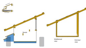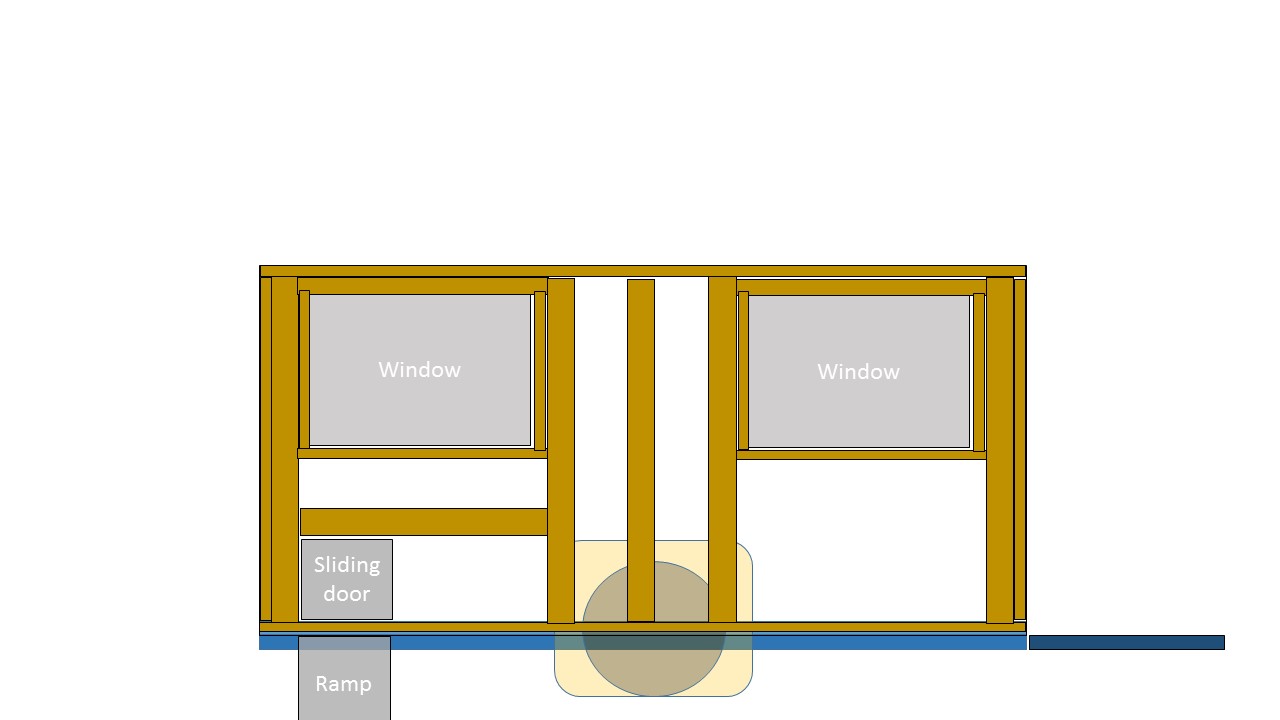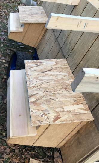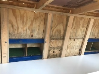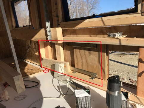 I started with framing where the door would slide. I framed is so the actuator and most of the rails could be enclosed with a piece of OSB (red outline with arrow pointing to the OSB) to prevent dirt and droppings from getting on them since the perch was close by. I cut a door that’s wide enough to cover the door opening and slide behind a piece of wood that will prevent the rails from being bent back allowing a predator to squeeze through the door. I attached the door and rails.