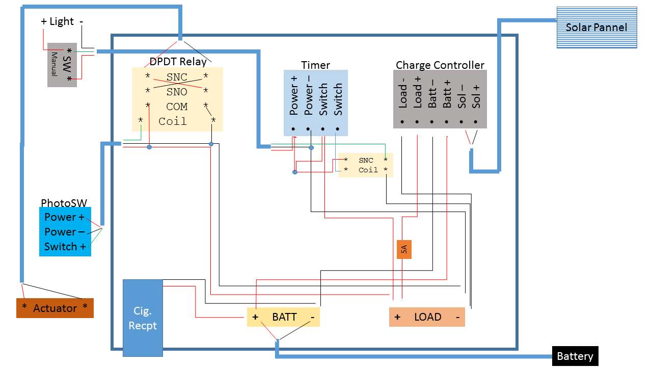 Hooking up the DPDT relay to switch the polarity for the actuator is fairly simple if you look at it in my diagram. You have two COM posts that you hook positive and negative to. Each one of those two posts will connect to 2 more post, one if the relay coil has power (SNO), the other if it doesn’t (SNC). To reverse the polarity connect the 4 posts in a crisscross pattern. The wire going to the actuator will connected to the 2nd pair. If the direction of the actuator is wrong, just revers the actuator connection.