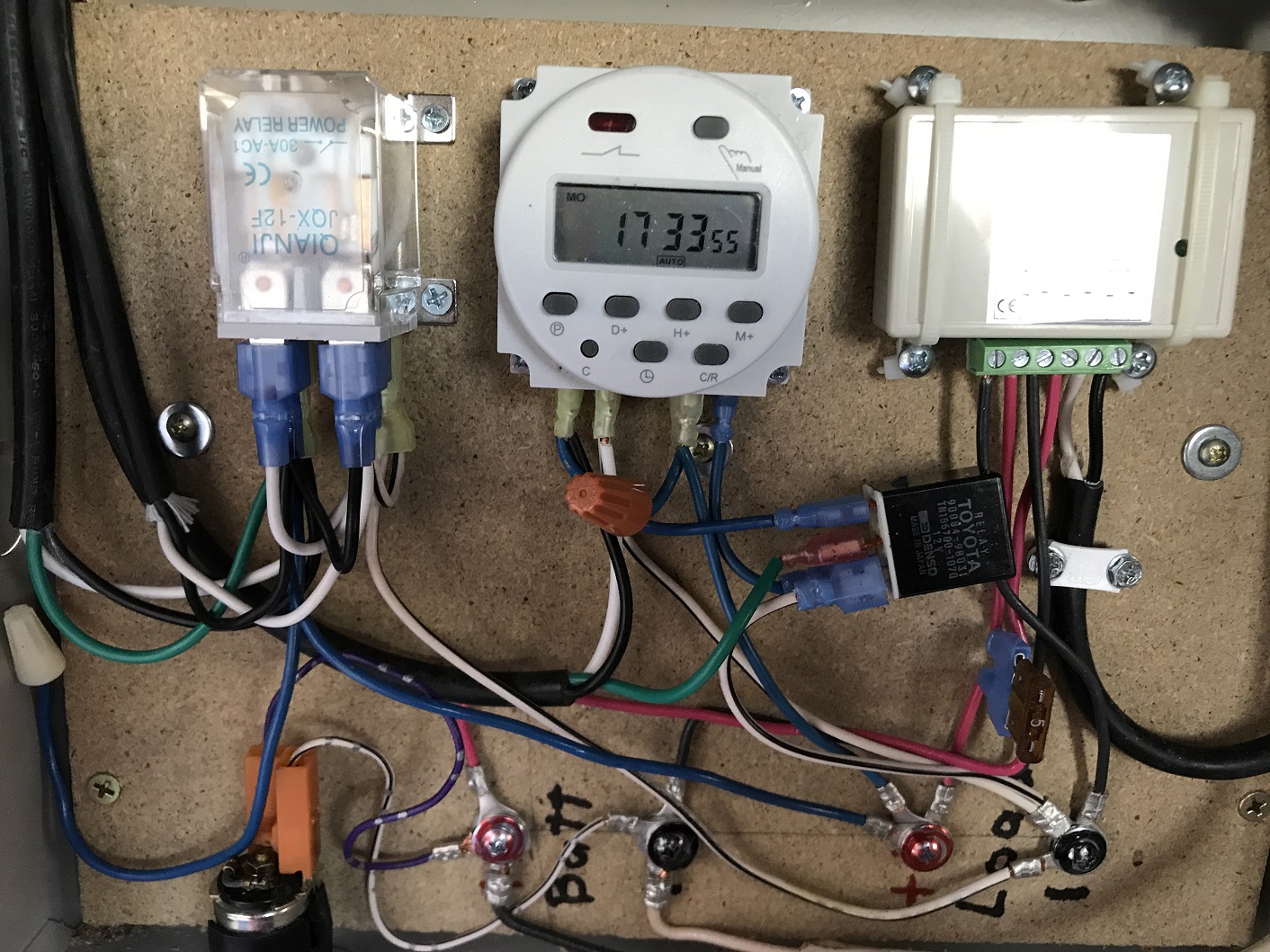 As I mentioned in my previous post on the lights, I need a relay for the timer to power the lights. I could not power my light directly through the light switch. I also used 3 wires going to the light so I could add a flip switch to override the timer and turn the lights on. These two items make the wire diagram look like spaghetti, but hopefully you can follow it.
