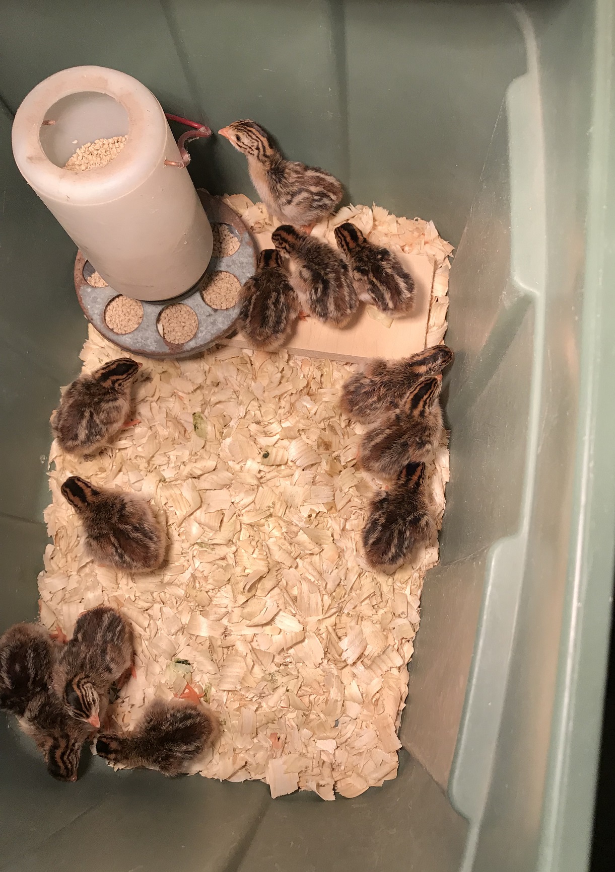 18 days prior to the attack we found a clutch of 40 guinea eggs hidden in tall weeds. I had people interested in guinea chicks if I could get them, so I figured I’d try hatching them. After the attach I was glad I did. I managed to fit 29 in the incubator, but not knowing which ones were newer or older it was just a crap-shoot on how many would hatch; 12 did.